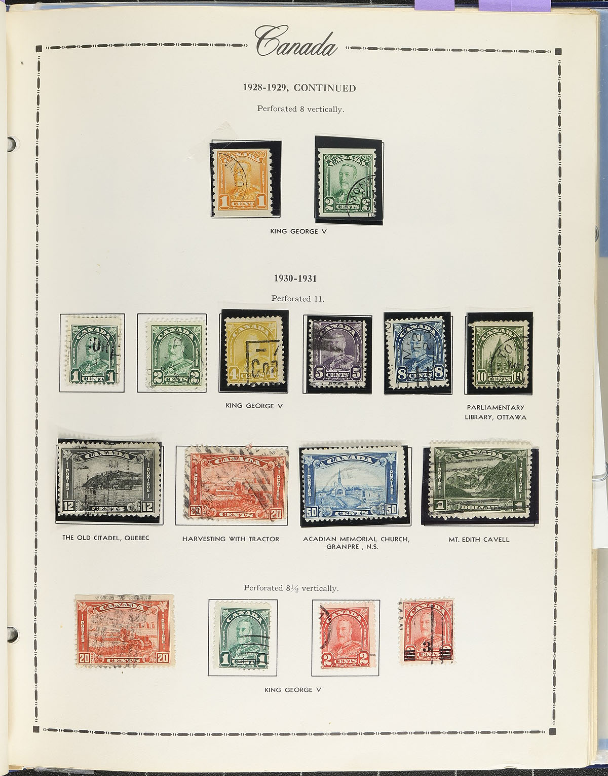 Terrific large collection / accumulation of primarily used Canada in a variety of formats filling a box. The main collection contains several hundreds of stamps in The Heritage Canadian Stamp Album, with material ranging from the Small Queens to 1980's, noting 40 used Small Queens (including 20c and 50c Widow Weeds), Jubilees 1c to 5c, partial sets of Leafs, Numerals, Edwards, Quebecs, Admirals, with full sets of Scrolls, Pictorials, War, and Peace issues. along with Airmails, Special Delivery, and more. The lot continues with a 32 page stockbook containing many hundreds of mint plate blocks (1950's-1960's), a 16 page stockbook containing an accumulation of high denomination used issues from the 1950's-1970's, and used accumulations of thousands of used stamps from the 1950's up to 2000 (noting postmarks from western provinces). The lot also includes a 2019 Unitrade catalogue, supplies, and roughly 500 slogan cancels (cut down from envelopes). A nice opportunity for Canada and postmark collectors, as we note many items cataloguing $5 to $15 and up. Our online photos show a sampling and an overview. Estimate =