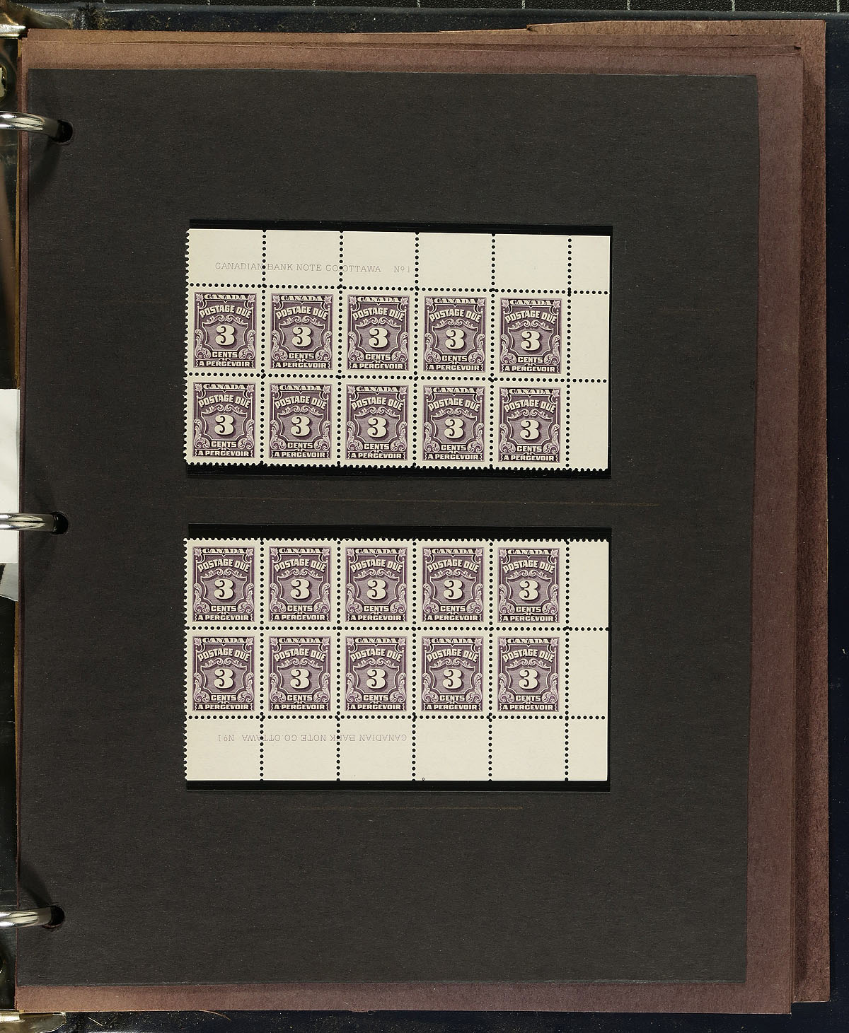 Collection of primarily mint Canada "Postage Due" issues, ranging from J2/J27 (majority of material from J15-J27), containing singles, pairs, and plate blocks of 10. Most of the material is in hingeless mounts, in roughly 20 pages, housed in a binder, noting lightly hinged stamps, or in the selvedge. A nice lot for the "back of the book" collector. 2024 Unitrade =