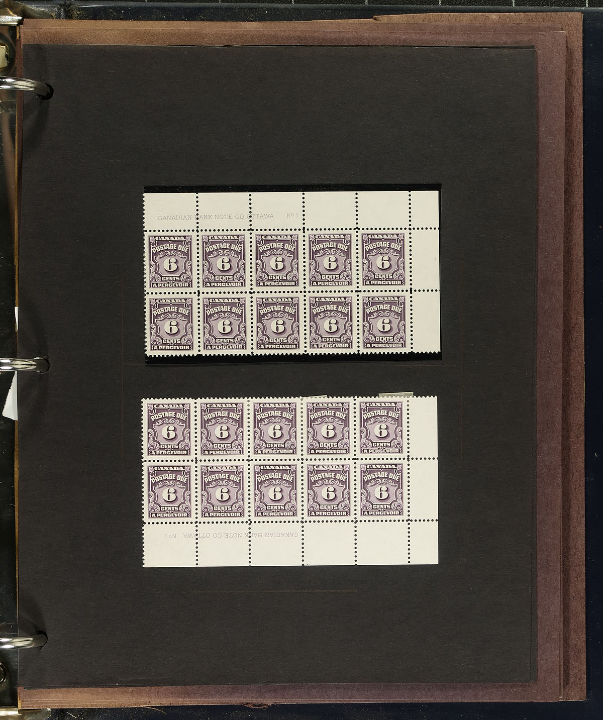 Collection of primarily mint Canada "Postage Due" issues, ranging from J2/J27 (majority of material from J15-J27), containing singles, pairs, and plate blocks of 10. Most of the material is in hingeless mounts, in roughly 20 pages, housed in a binder, noting lightly hinged stamps, or in the selvedge. A nice lot for the "back of the book" collector. 2024 Unitrade =
