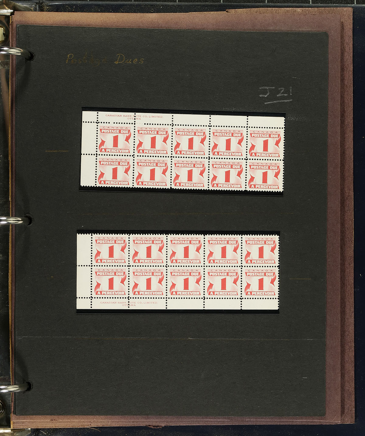 Collection of primarily mint Canada "Postage Due" issues, ranging from J2/J27 (majority of material from J15-J27), containing singles, pairs, and plate blocks of 10. Most of the material is in hingeless mounts, in roughly 20 pages, housed in a binder, noting lightly hinged stamps, or in the selvedge. A nice lot for the "back of the book" collector. 2024 Unitrade =