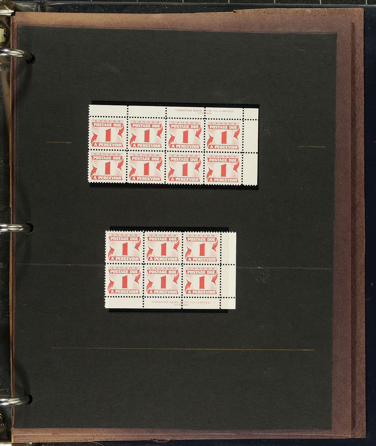 Collection of primarily mint Canada "Postage Due" issues, ranging from J2/J27 (majority of material from J15-J27), containing singles, pairs, and plate blocks of 10. Most of the material is in hingeless mounts, in roughly 20 pages, housed in a binder, noting lightly hinged stamps, or in the selvedge. A nice lot for the "back of the book" collector. 2024 Unitrade =