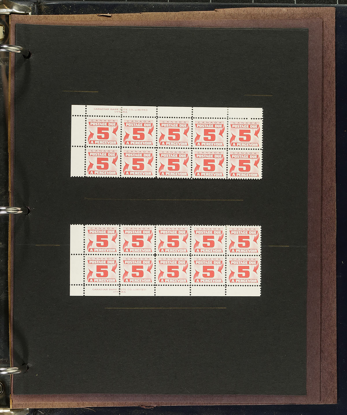 Collection of primarily mint Canada "Postage Due" issues, ranging from J2/J27 (majority of material from J15-J27), containing singles, pairs, and plate blocks of 10. Most of the material is in hingeless mounts, in roughly 20 pages, housed in a binder, noting lightly hinged stamps, or in the selvedge. A nice lot for the "back of the book" collector. 2024 Unitrade =