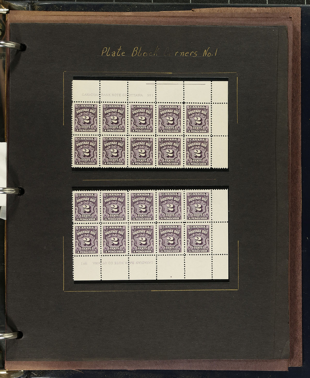 Collection of primarily mint Canada "Postage Due" issues, ranging from J2/J27 (majority of material from J15-J27), containing singles, pairs, and plate blocks of 10. Most of the material is in hingeless mounts, in roughly 20 pages, housed in a binder, noting lightly hinged stamps, or in the selvedge. A nice lot for the "back of the book" collector. 2024 Unitrade =
