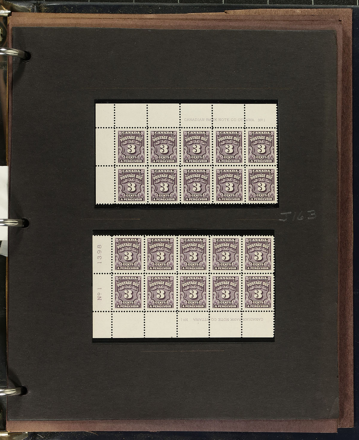 Collection of primarily mint Canada "Postage Due" issues, ranging from J2/J27 (majority of material from J15-J27), containing singles, pairs, and plate blocks of 10. Most of the material is in hingeless mounts, in roughly 20 pages, housed in a binder, noting lightly hinged stamps, or in the selvedge. A nice lot for the "back of the book" collector. 2024 Unitrade =