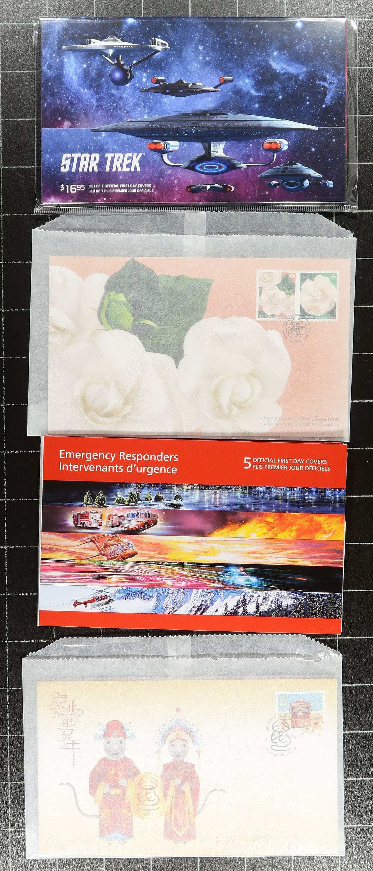 First Day Covers. Lovely group of modern Canada first day covers, 2017-2019, containing roughly 70 covers, some still in presentation packs sealed from the philatelic service. The lot includes sealed packs of Star Trek (Unitrade #2984-#2990), Canada 150 (Unitrade #3000-#3009), to name a few, along with singles, sets, and souvenir sheet frankings. We note a few first day covers cataloguing $10 and up each. A nice clean lot for all collectors. 2024 Unitrade =
