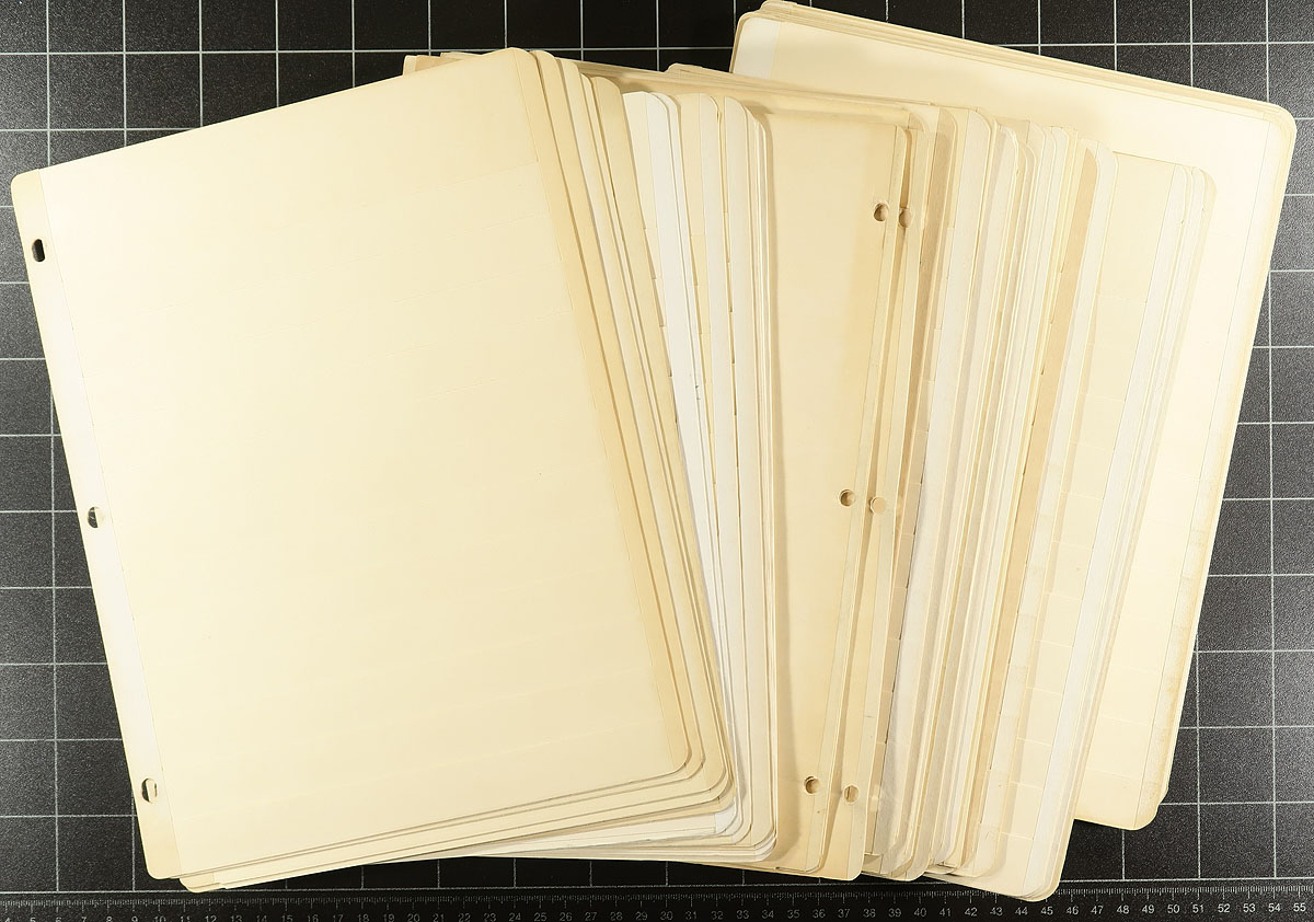 Gently used supplies filling a carton, of note a few stock books, roughly 70 manila stock pages, roughly 100 Vario-style stock pages (various configurations), several mounts with large guillotine, perforation gauges, Unity supplemental pages from 2000-2012, and more. A useful group, waiting for a new owner. Estimate =