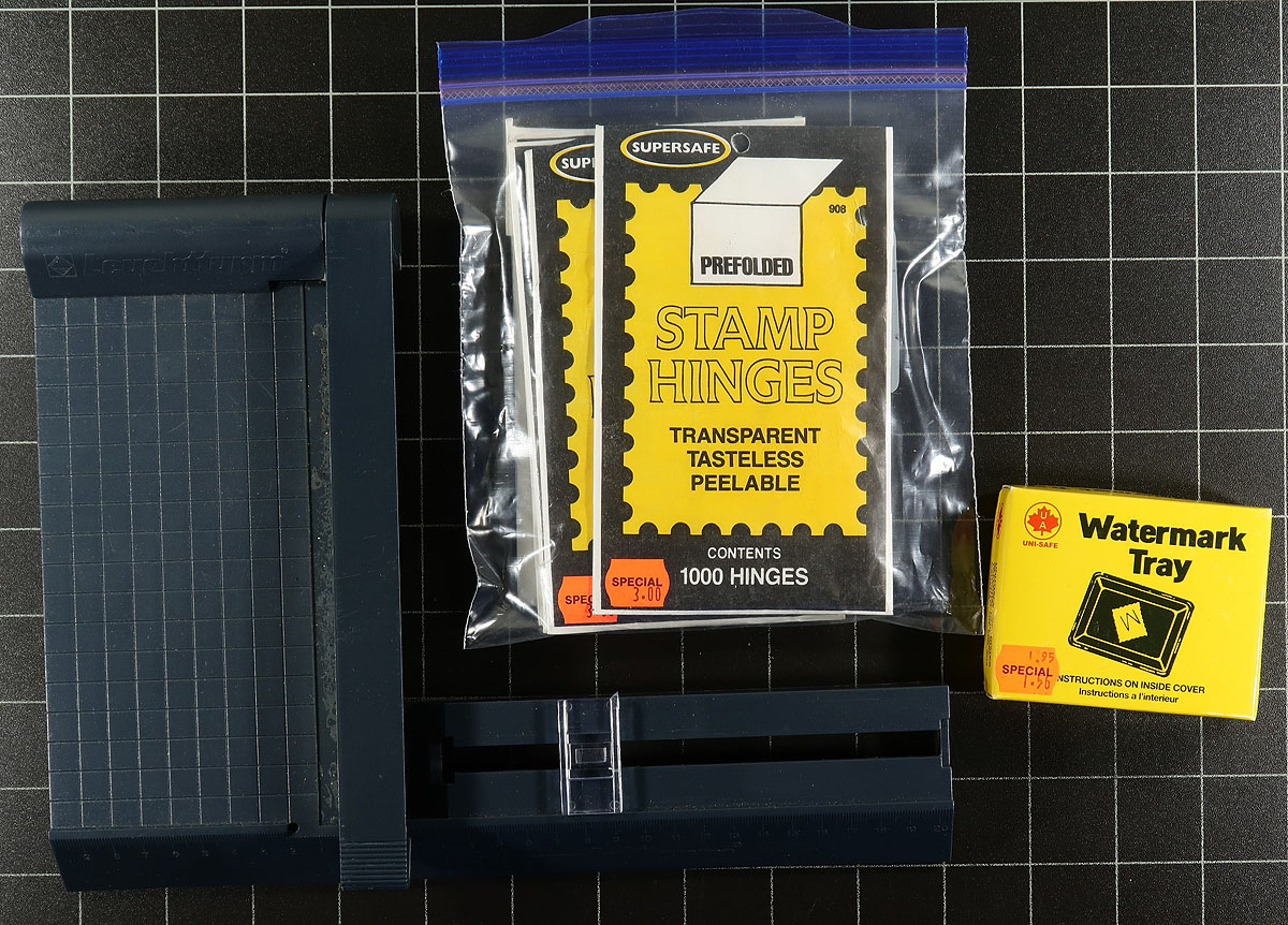 Gently used supplies filling a carton, of note a few stock books, roughly 70 manila stock pages, roughly 100 Vario-style stock pages (various configurations), several mounts with large guillotine, perforation gauges, Unity supplemental pages from 2000-2012, and more. A useful group, waiting for a new owner. Estimate =