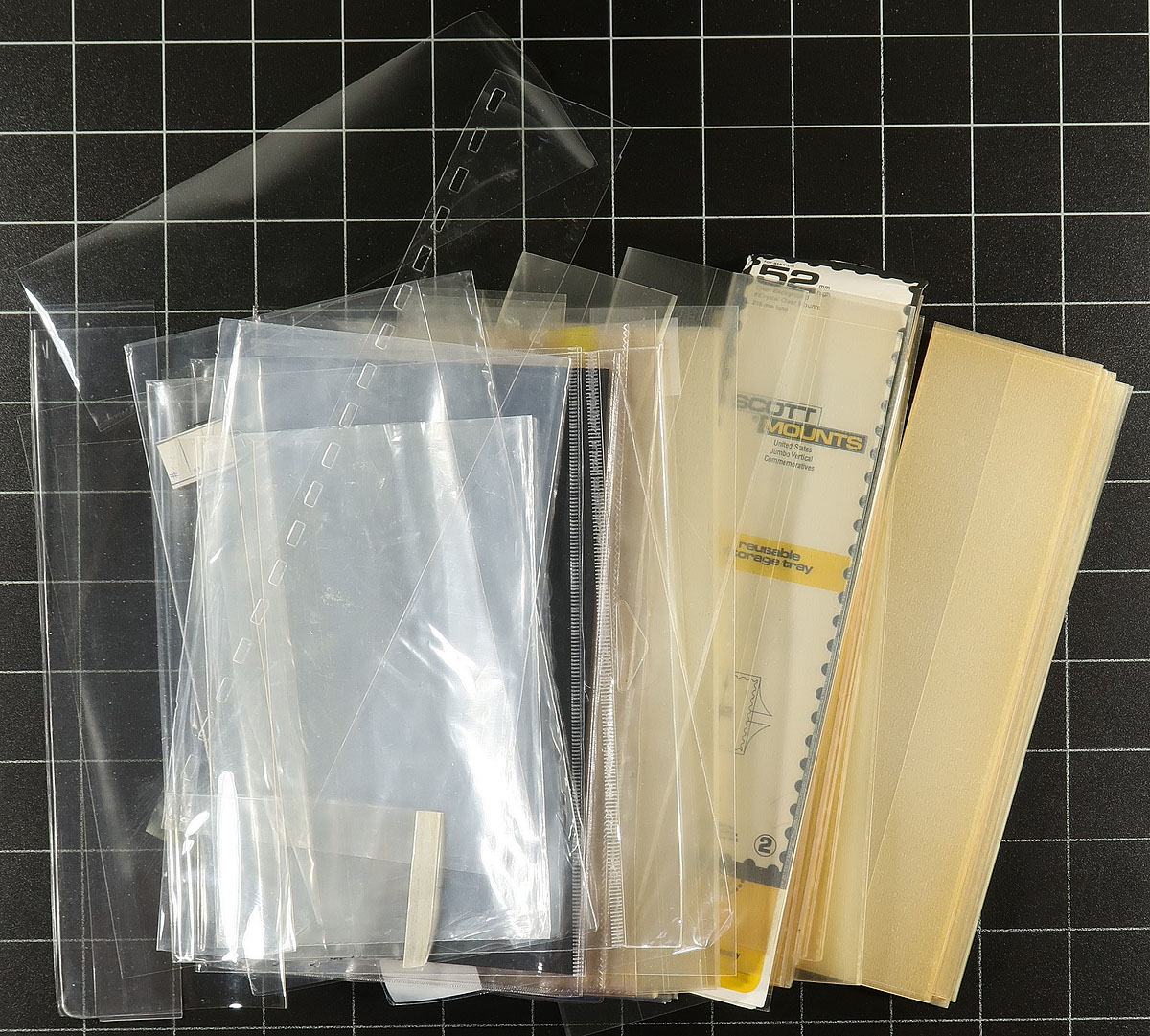 Gently used supplies filling a carton, of note a few stock books, roughly 70 manila stock pages, roughly 100 Vario-style stock pages (various configurations), several mounts with large guillotine, perforation gauges, Unity supplemental pages from 2000-2012, and more. A useful group, waiting for a new owner. Estimate =