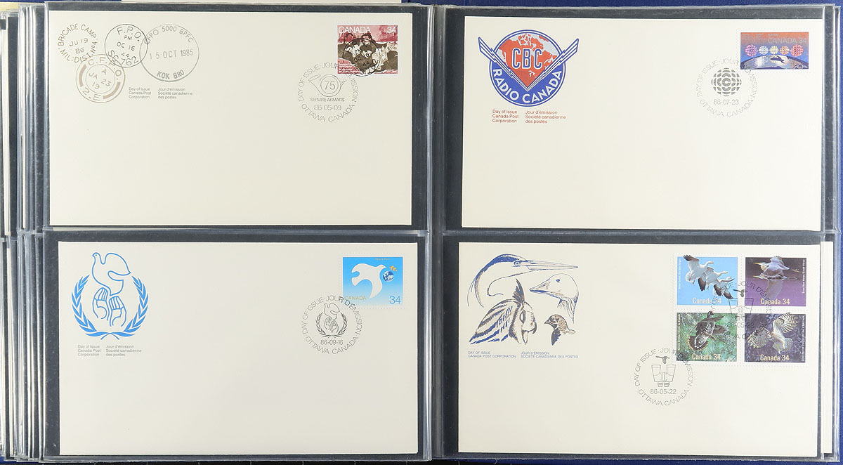 First Day Covers. Clean collection of Canada first day covers, 1975-1986, containing roughly 500 covers in 3 cover albums and with loose material. We note single, pairs, sets, and plate blocks frankings (one of each type for most 1970s issues), along with a few high denomination frankings. The lot also includes one numismatic first day cover. We note some mild duplication with a few covers, a nice clean group for collectors and dealers alike. Estimate =