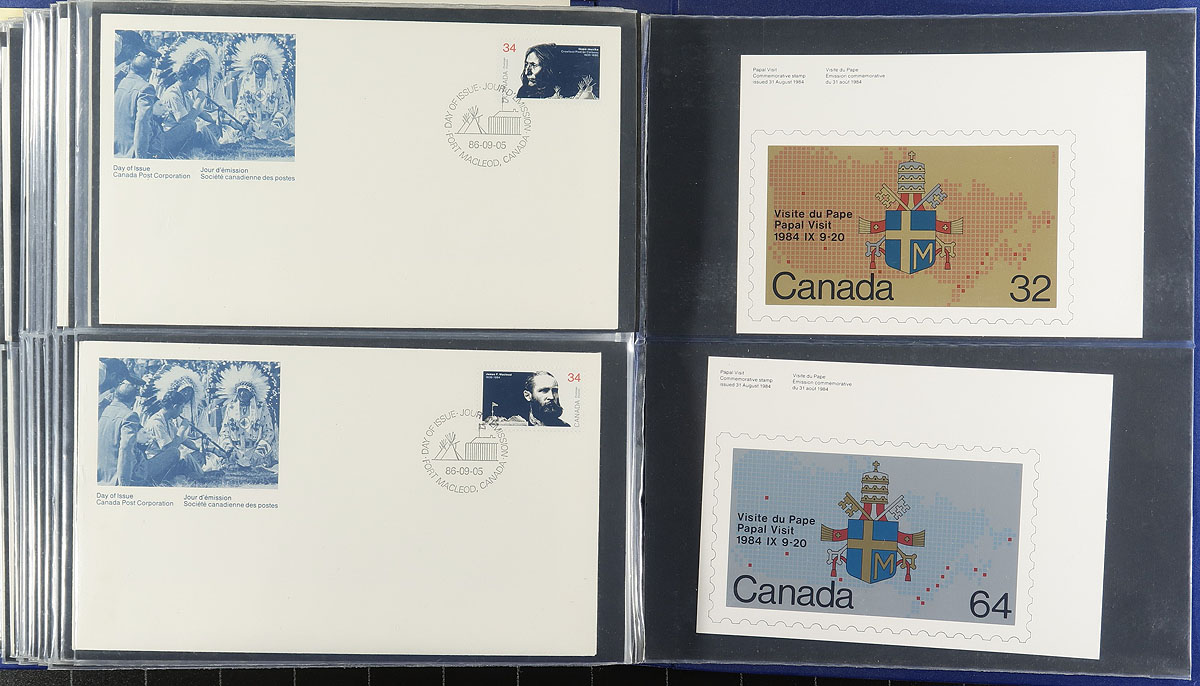 First Day Covers. Clean collection of Canada first day covers, 1975-1986, containing roughly 500 covers in 3 cover albums and with loose material. We note single, pairs, sets, and plate blocks frankings (one of each type for most 1970s issues), along with a few high denomination frankings. The lot also includes one numismatic first day cover. We note some mild duplication with a few covers, a nice clean group for collectors and dealers alike. Estimate =