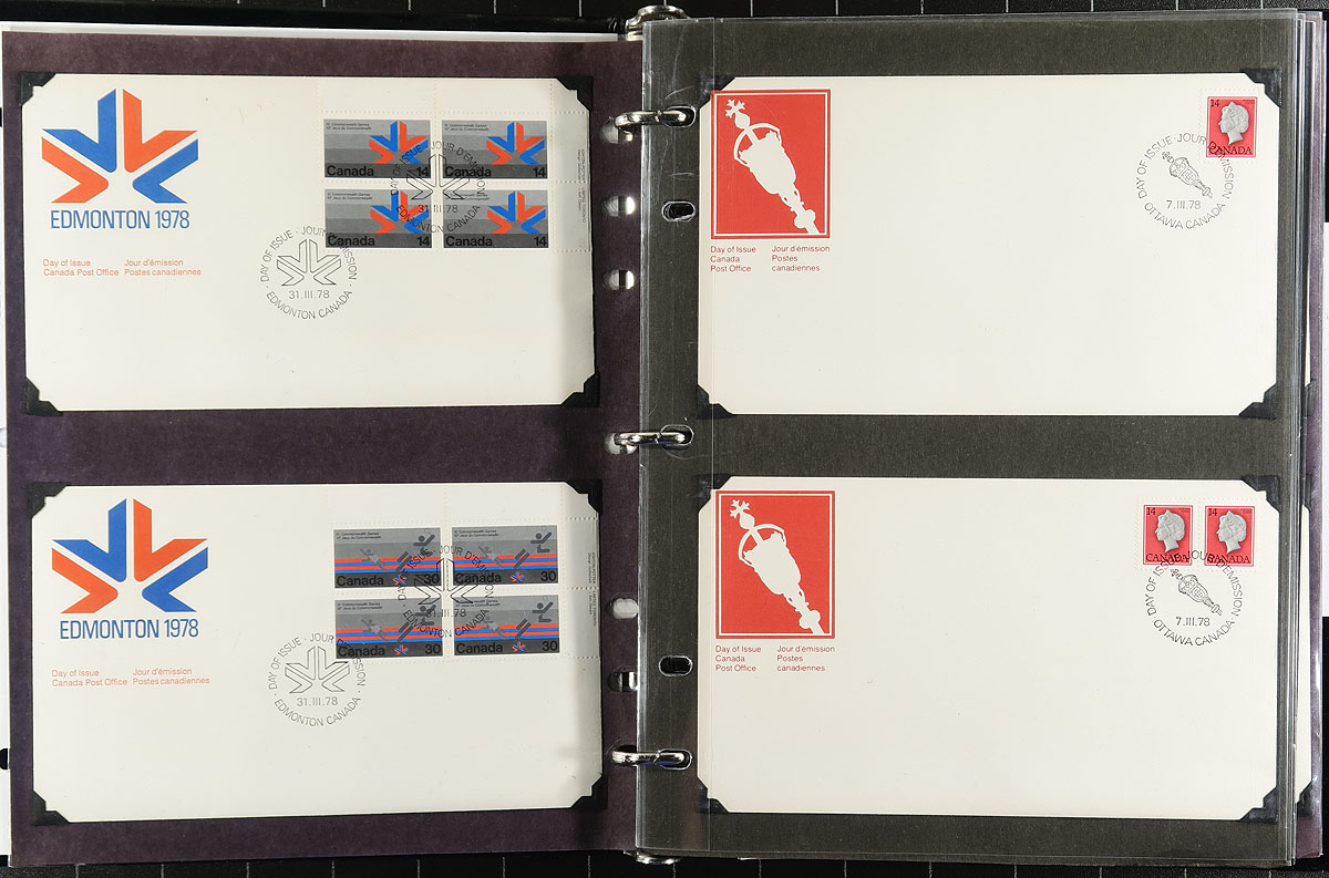 First Day Covers. Clean collection of Canada first day covers, 1975-1986, containing roughly 500 covers in 3 cover albums and with loose material. We note single, pairs, sets, and plate blocks frankings (one of each type for most 1970s issues), along with a few high denomination frankings. The lot also includes one numismatic first day cover. We note some mild duplication with a few covers, a nice clean group for collectors and dealers alike. Estimate =