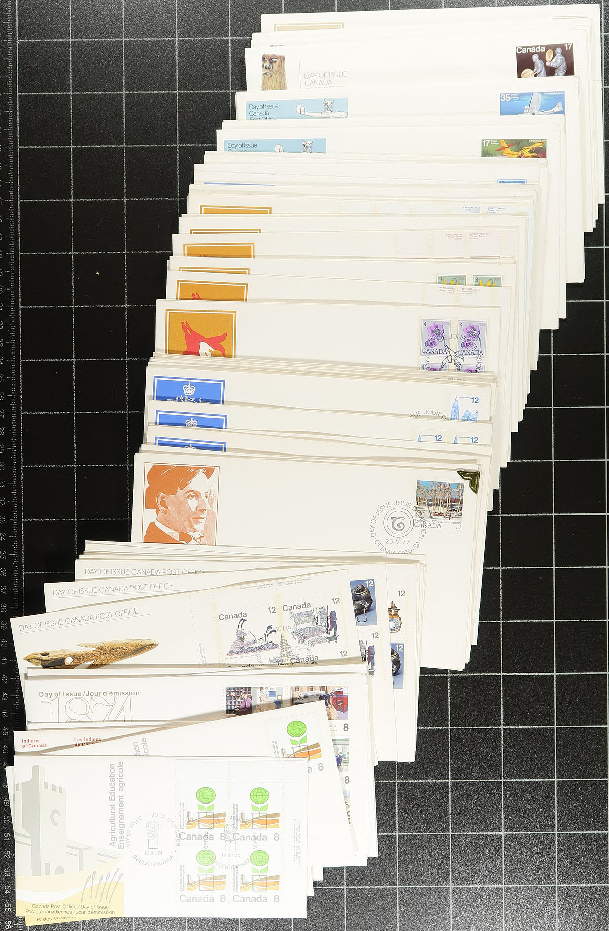 First Day Covers. Clean collection of Canada first day covers, 1975-1986, containing roughly 500 covers in 3 cover albums and with loose material. We note single, pairs, sets, and plate blocks frankings (one of each type for most 1970s issues), along with a few high denomination frankings. The lot also includes one numismatic first day cover. We note some mild duplication with a few covers, a nice clean group for collectors and dealers alike. Estimate =