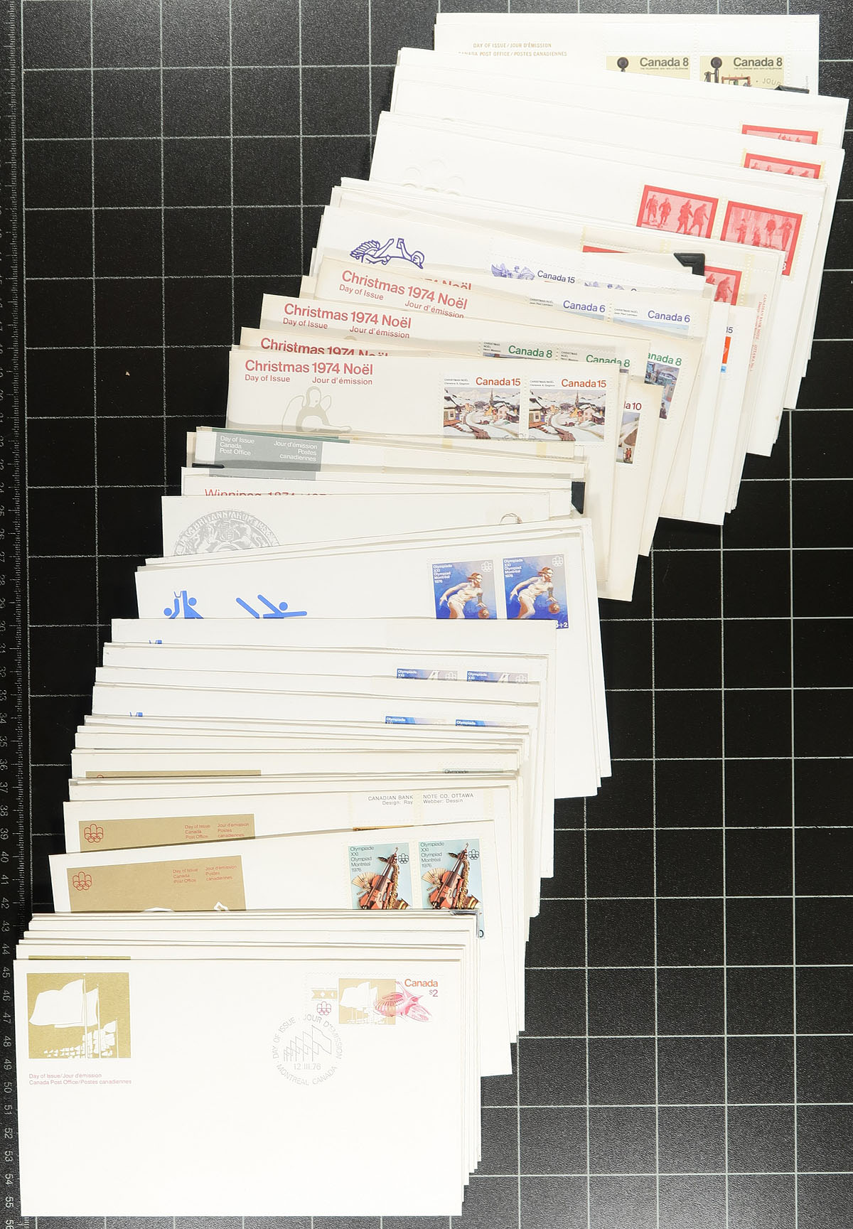 First Day Covers. Clean collection of Canada first day covers, 1975-1986, containing roughly 500 covers in 3 cover albums and with loose material. We note single, pairs, sets, and plate blocks frankings (one of each type for most 1970s issues), along with a few high denomination frankings. The lot also includes one numismatic first day cover. We note some mild duplication with a few covers, a nice clean group for collectors and dealers alike. Estimate =