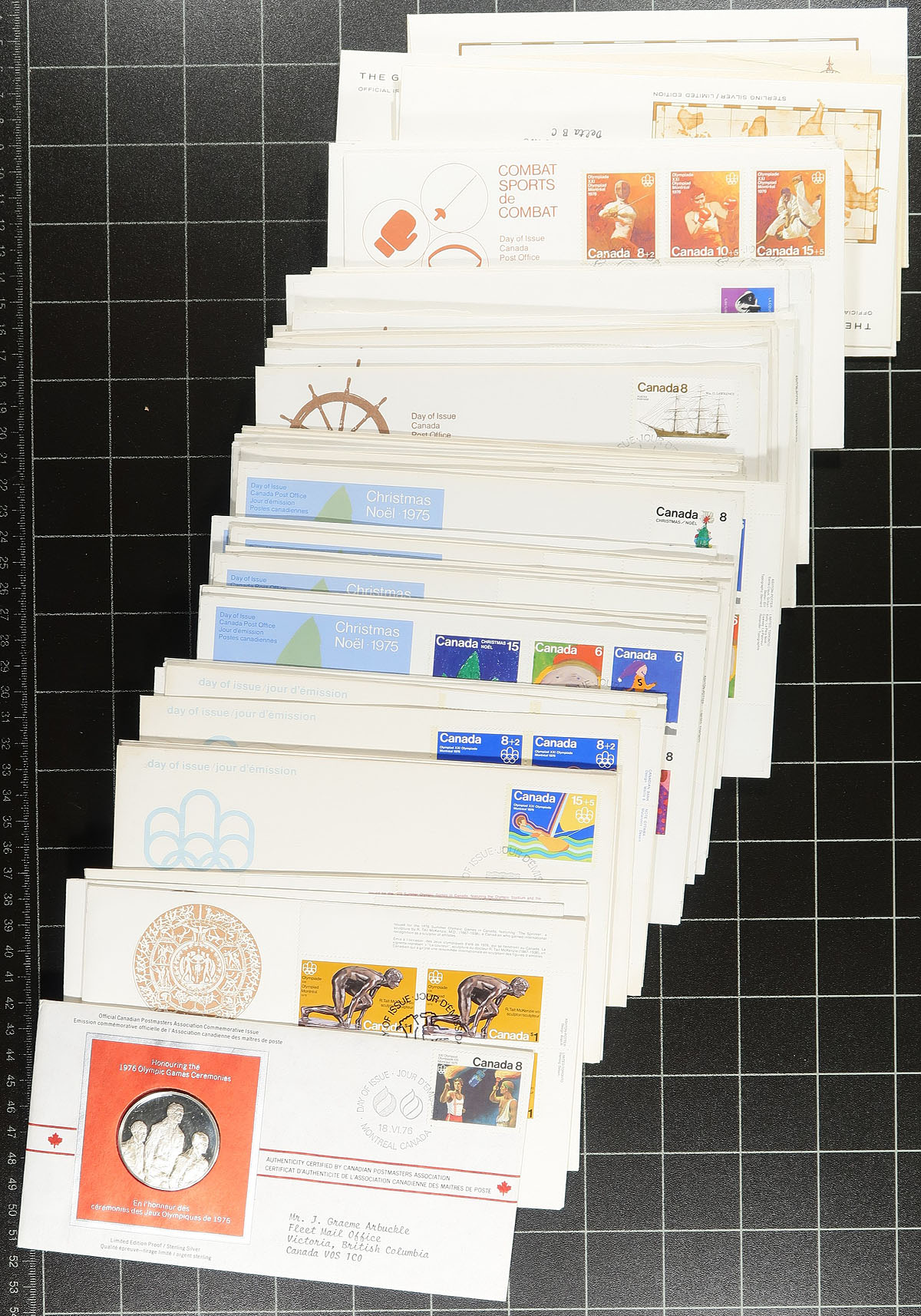 First Day Covers. Clean collection of Canada first day covers, 1975-1986, containing roughly 500 covers in 3 cover albums and with loose material. We note single, pairs, sets, and plate blocks frankings (one of each type for most 1970s issues), along with a few high denomination frankings. The lot also includes one numismatic first day cover. We note some mild duplication with a few covers, a nice clean group for collectors and dealers alike. Estimate =