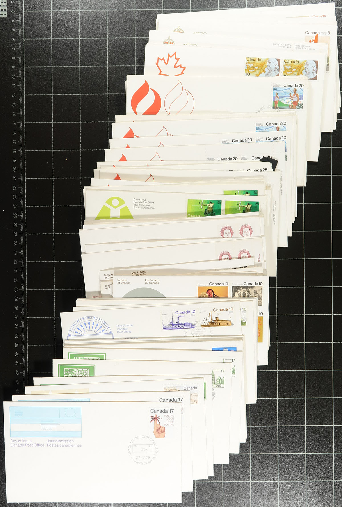 First Day Covers. Clean collection of Canada first day covers, 1975-1986, containing roughly 500 covers in 3 cover albums and with loose material. We note single, pairs, sets, and plate blocks frankings (one of each type for most 1970s issues), along with a few high denomination frankings. The lot also includes one numismatic first day cover. We note some mild duplication with a few covers, a nice clean group for collectors and dealers alike. Estimate =