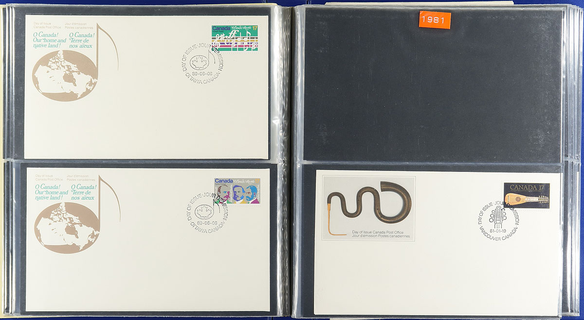 First Day Covers. Clean collection of Canada first day covers, 1975-1986, containing roughly 500 covers in 3 cover albums and with loose material. We note single, pairs, sets, and plate blocks frankings (one of each type for most 1970s issues), along with a few high denomination frankings. The lot also includes one numismatic first day cover. We note some mild duplication with a few covers, a nice clean group for collectors and dealers alike. Estimate =