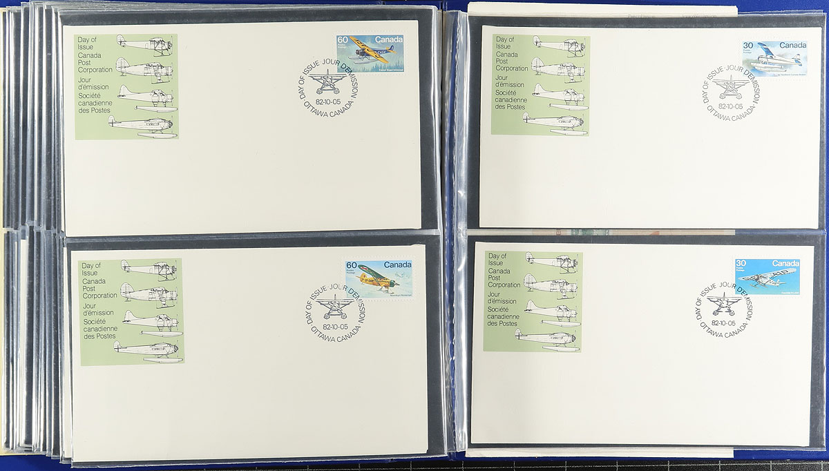 First Day Covers. Clean collection of Canada first day covers, 1975-1986, containing roughly 500 covers in 3 cover albums and with loose material. We note single, pairs, sets, and plate blocks frankings (one of each type for most 1970s issues), along with a few high denomination frankings. The lot also includes one numismatic first day cover. We note some mild duplication with a few covers, a nice clean group for collectors and dealers alike. Estimate =