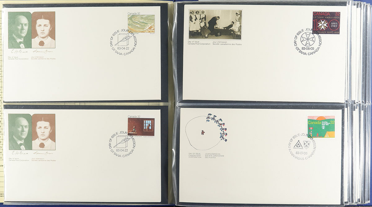 First Day Covers. Clean collection of Canada first day covers, 1975-1986, containing roughly 500 covers in 3 cover albums and with loose material. We note single, pairs, sets, and plate blocks frankings (one of each type for most 1970s issues), along with a few high denomination frankings. The lot also includes one numismatic first day cover. We note some mild duplication with a few covers, a nice clean group for collectors and dealers alike. Estimate =