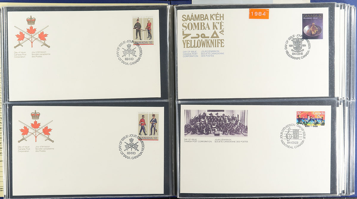 First Day Covers. Clean collection of Canada first day covers, 1975-1986, containing roughly 500 covers in 3 cover albums and with loose material. We note single, pairs, sets, and plate blocks frankings (one of each type for most 1970s issues), along with a few high denomination frankings. The lot also includes one numismatic first day cover. We note some mild duplication with a few covers, a nice clean group for collectors and dealers alike. Estimate =