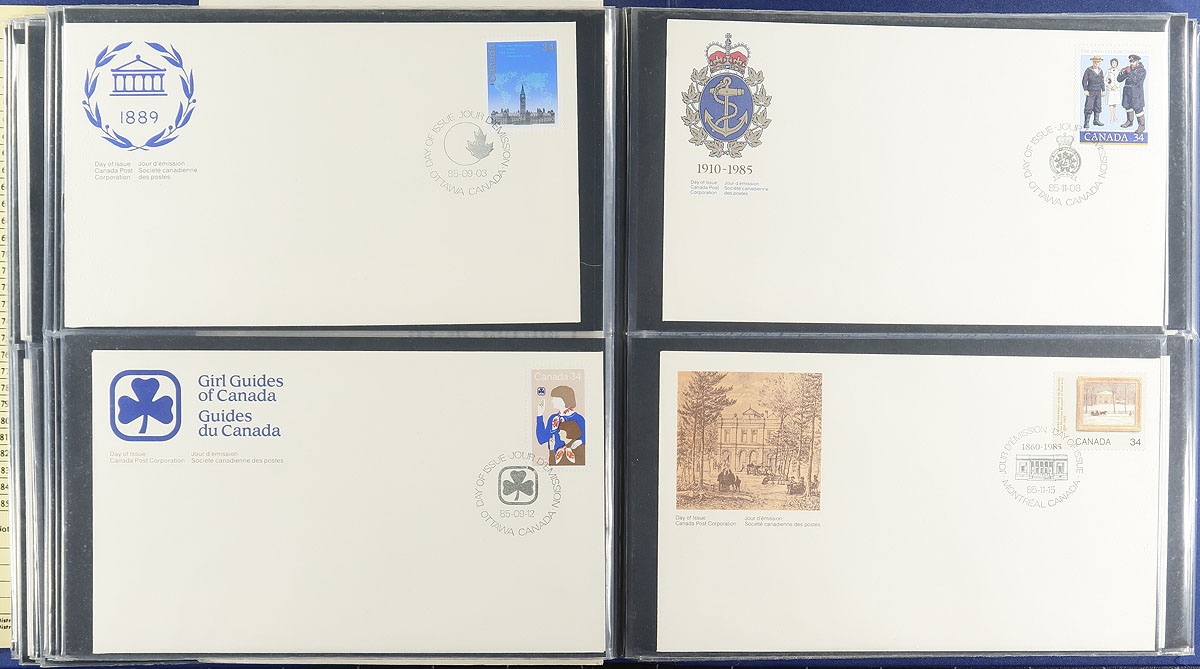 First Day Covers. Clean collection of Canada first day covers, 1975-1986, containing roughly 500 covers in 3 cover albums and with loose material. We note single, pairs, sets, and plate blocks frankings (one of each type for most 1970s issues), along with a few high denomination frankings. The lot also includes one numismatic first day cover. We note some mild duplication with a few covers, a nice clean group for collectors and dealers alike. Estimate =