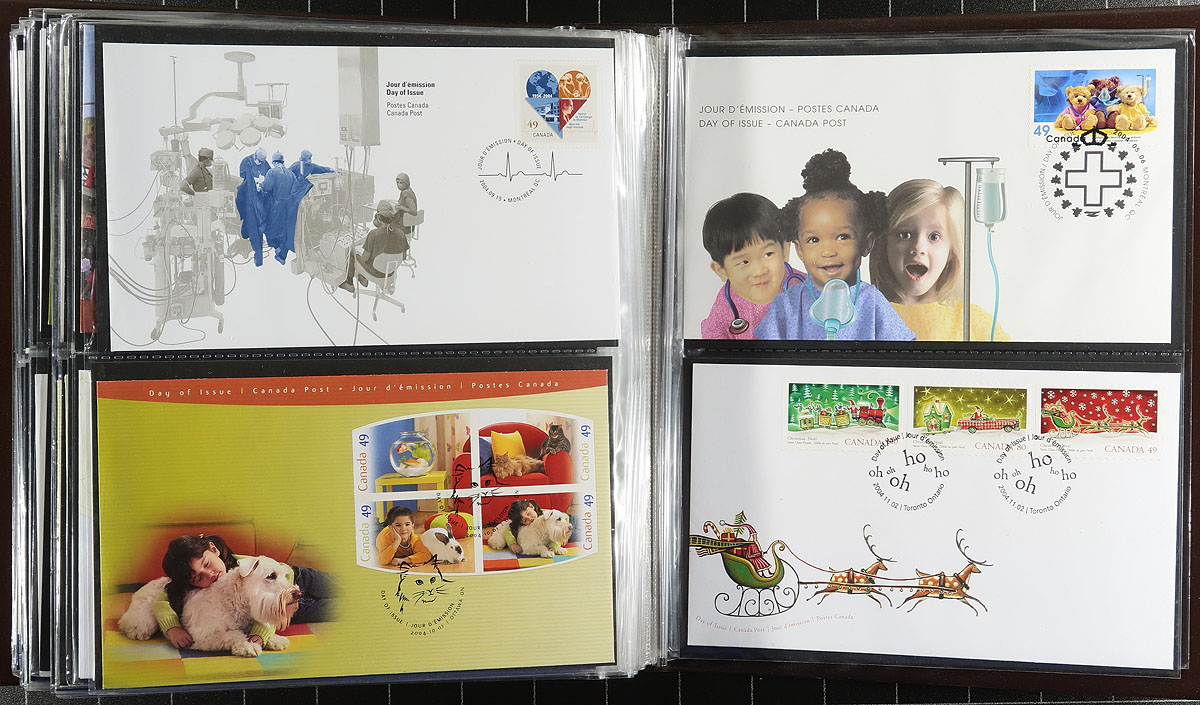 First Day Covers. Clean collection of Canada first day covers, 1987-2004, containing roughly 450 covers, well organized by year in 5 cover albums. We note singles, sets, souvenir sheet, coils, booklet issues, and high denomination frankings. A nice clean lot for collectors and dealers alike. Estimate =