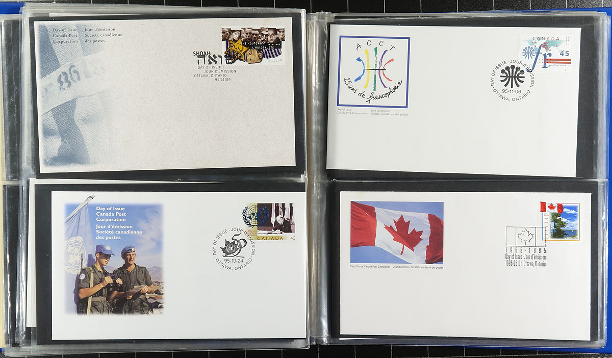First Day Covers. Clean collection of Canada first day covers, 1987-2004, containing roughly 450 covers, well organized by year in 5 cover albums. We note singles, sets, souvenir sheet, coils, booklet issues, and high denomination frankings. A nice clean lot for collectors and dealers alike. Estimate =