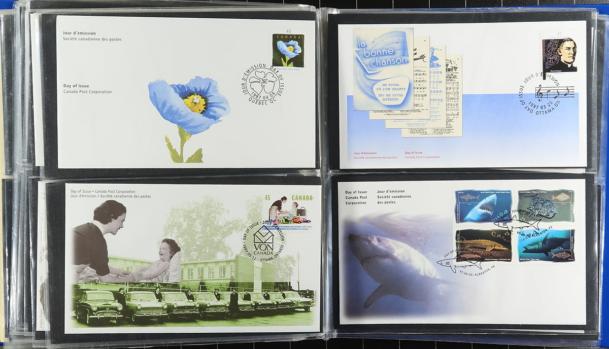 First Day Covers. Clean collection of Canada first day covers, 1987-2004, containing roughly 450 covers, well organized by year in 5 cover albums. We note singles, sets, souvenir sheet, coils, booklet issues, and high denomination frankings. A nice clean lot for collectors and dealers alike. Estimate =