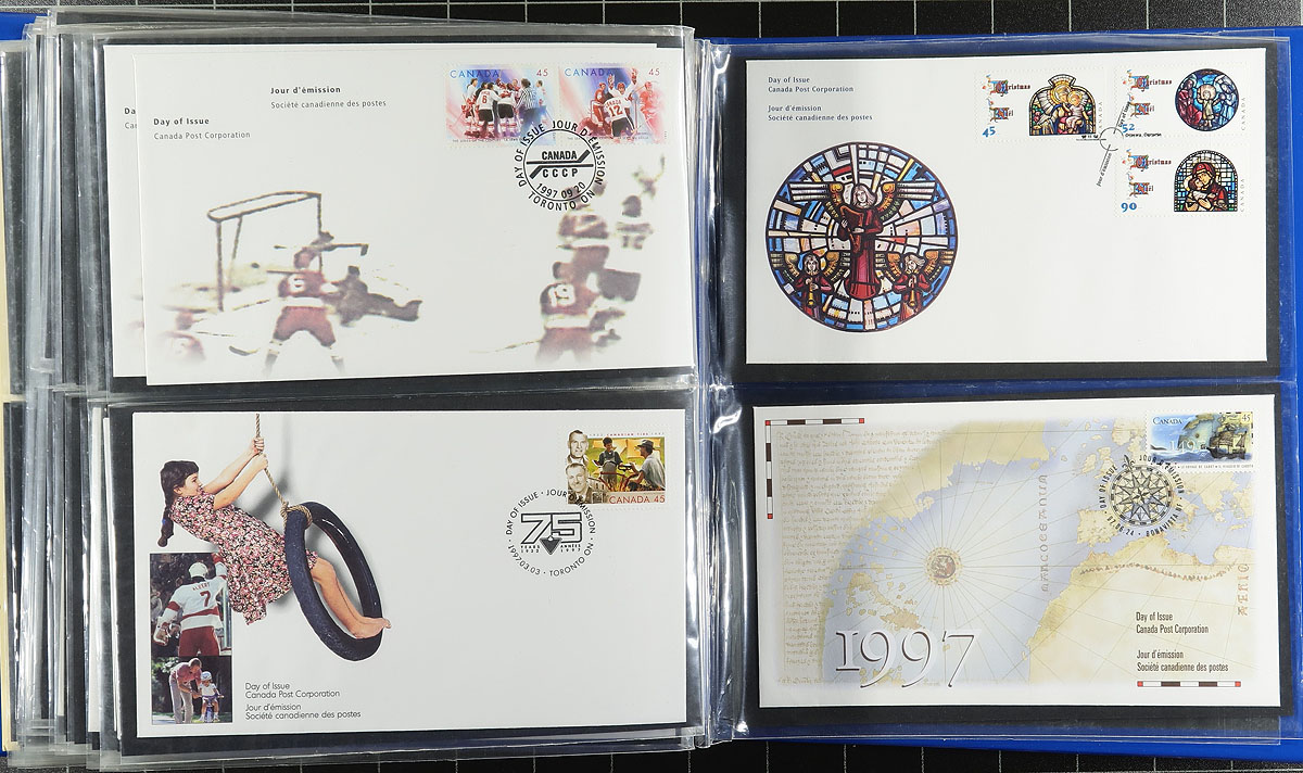 First Day Covers. Clean collection of Canada first day covers, 1987-2004, containing roughly 450 covers, well organized by year in 5 cover albums. We note singles, sets, souvenir sheet, coils, booklet issues, and high denomination frankings. A nice clean lot for collectors and dealers alike. Estimate =