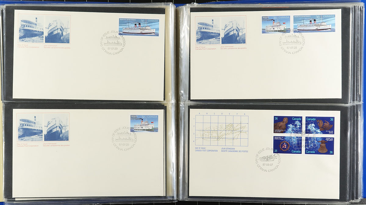 First Day Covers. Clean collection of Canada first day covers, 1987-2004, containing roughly 450 covers, well organized by year in 5 cover albums. We note singles, sets, souvenir sheet, coils, booklet issues, and high denomination frankings. A nice clean lot for collectors and dealers alike. Estimate =