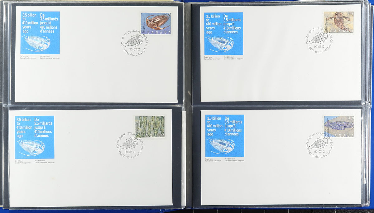 First Day Covers. Clean collection of Canada first day covers, 1987-2004, containing roughly 450 covers, well organized by year in 5 cover albums. We note singles, sets, souvenir sheet, coils, booklet issues, and high denomination frankings. A nice clean lot for collectors and dealers alike. Estimate =
