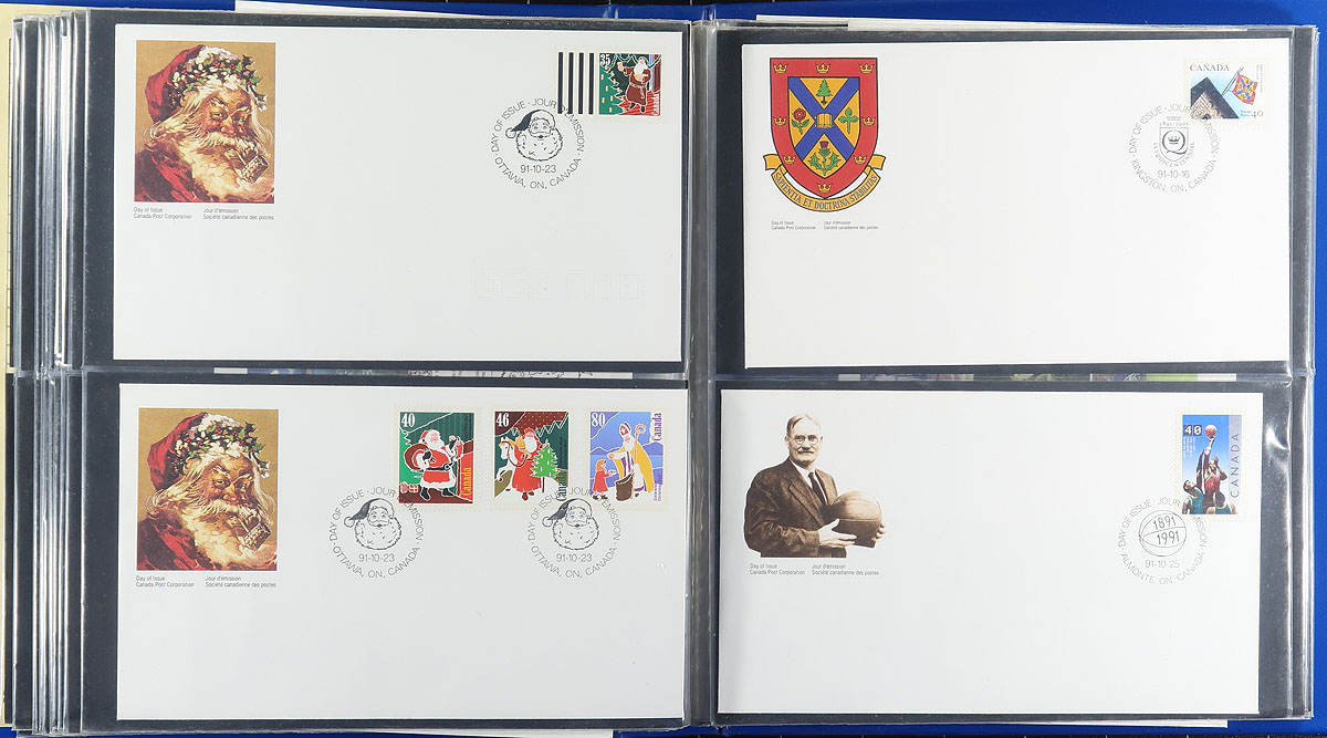 First Day Covers. Clean collection of Canada first day covers, 1987-2004, containing roughly 450 covers, well organized by year in 5 cover albums. We note singles, sets, souvenir sheet, coils, booklet issues, and high denomination frankings. A nice clean lot for collectors and dealers alike. Estimate =