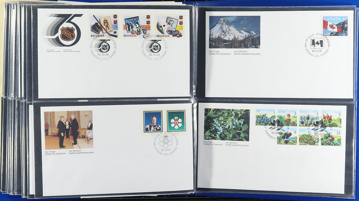 First Day Covers. Clean collection of Canada first day covers, 1987-2004, containing roughly 450 covers, well organized by year in 5 cover albums. We note singles, sets, souvenir sheet, coils, booklet issues, and high denomination frankings. A nice clean lot for collectors and dealers alike. Estimate =