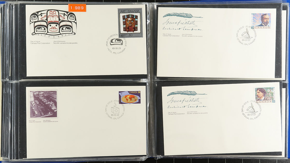 First Day Covers. Clean collection of Canada first day covers, 1987-2004, containing roughly 450 covers, well organized by year in 5 cover albums. We note singles, sets, souvenir sheet, coils, booklet issues, and high denomination frankings. A nice clean lot for collectors and dealers alike. Estimate =