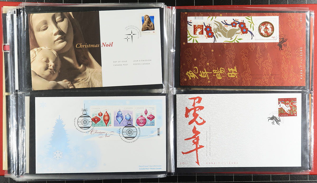 First Day Covers. Lovely collection of Canada first day covers, 2005-2017, containing roughly 325 covers, well organized by year in 4 cover albums. We note singles, sets, souvenir sheet, coils, and high denomination frankings. A nice clean lot for collectors and dealers alike. Estimate =
