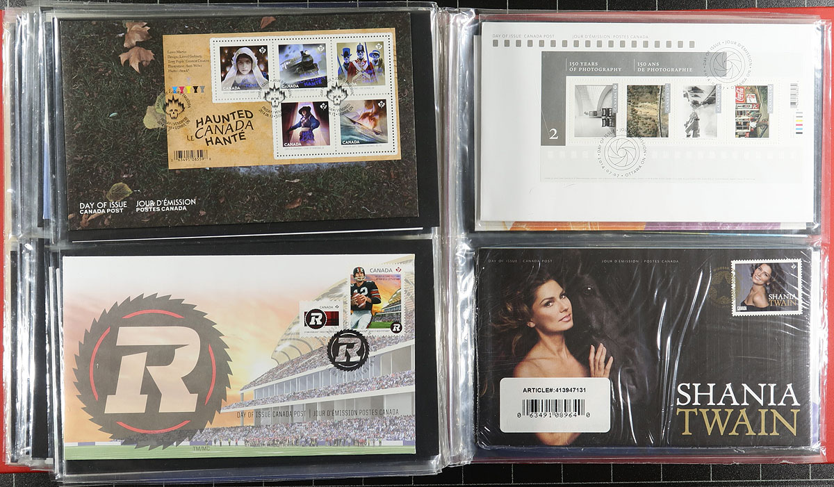 First Day Covers. Lovely collection of Canada first day covers, 2005-2017, containing roughly 325 covers, well organized by year in 4 cover albums. We note singles, sets, souvenir sheet, coils, and high denomination frankings. A nice clean lot for collectors and dealers alike. Estimate =