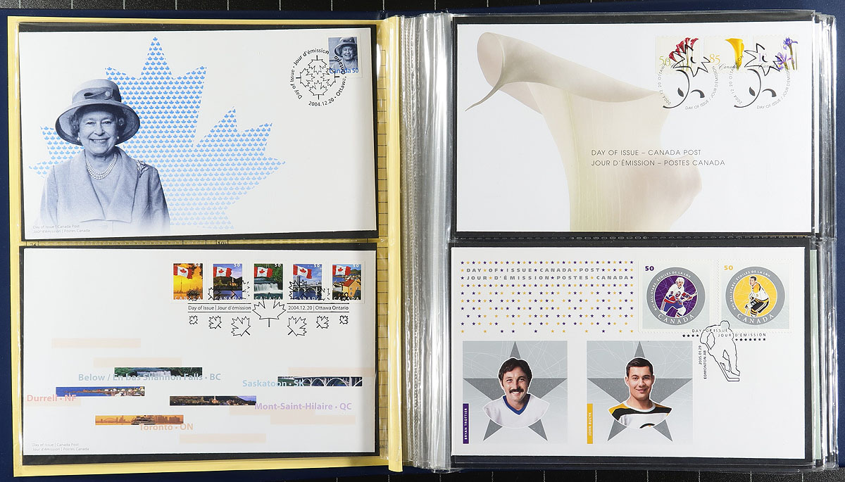 First Day Covers. Lovely collection of Canada first day covers, 2005-2017, containing roughly 325 covers, well organized by year in 4 cover albums. We note singles, sets, souvenir sheet, coils, and high denomination frankings. A nice clean lot for collectors and dealers alike. Estimate =