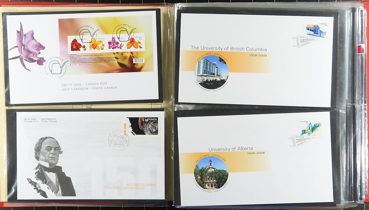 First Day Covers. Lovely collection of Canada first day covers, 2005-2017, containing roughly 325 covers, well organized by year in 4 cover albums. We note singles, sets, souvenir sheet, coils, and high denomination frankings. A nice clean lot for collectors and dealers alike. Estimate =