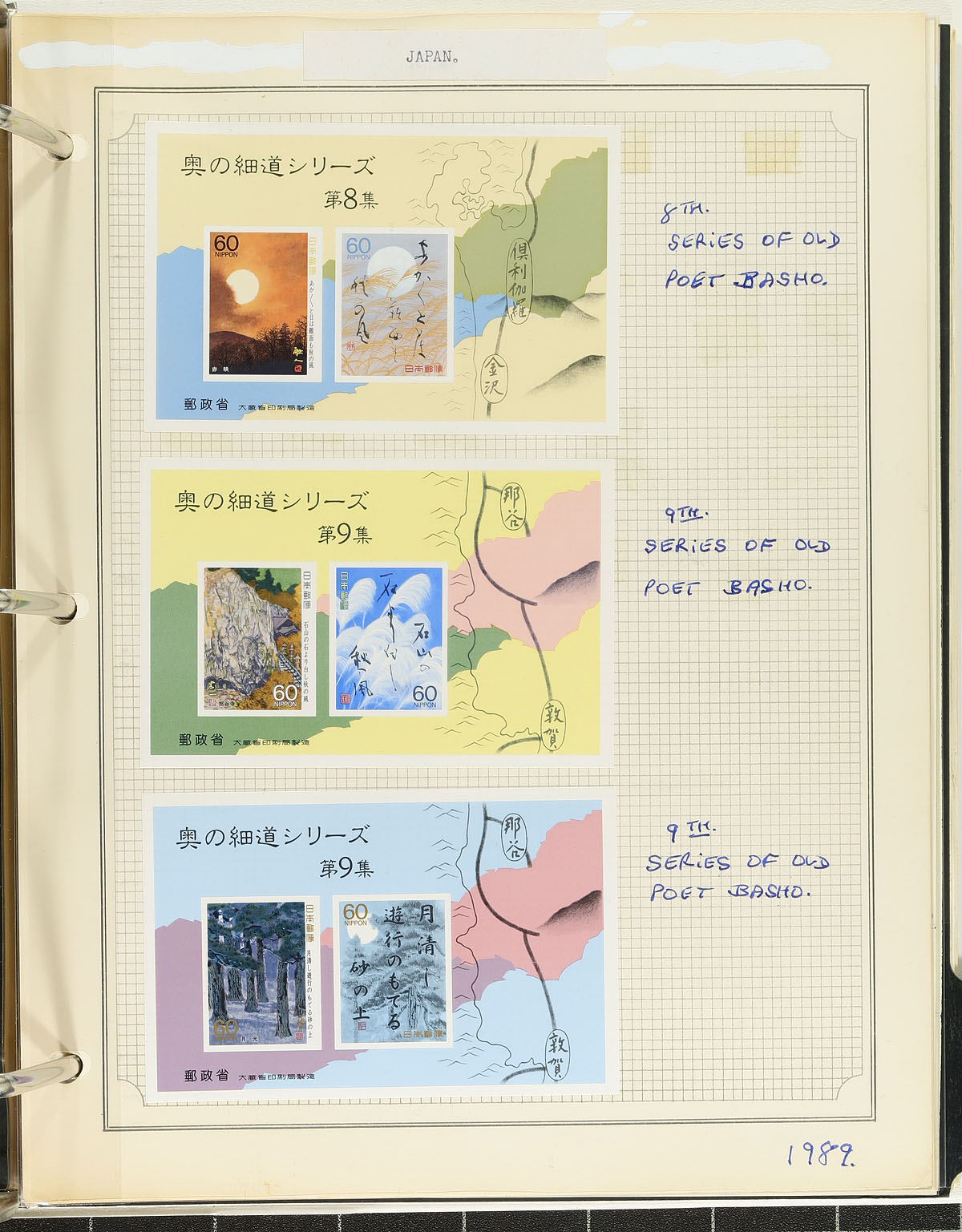 Collection of mint and used Japan, 1880's-1990's, containing a few thousand stamps, in roughly 100 well described pages, housed in 2 binders. The collection begins with primarily used issues up to 1940, and continues with a mixture of mint and used material, with some issues having a mint and a used example, along with a selection of souvenir sheets. A spot check revealed a few items cataloguing $10 and up, including Scott #519 (mh and used, c.v. $75 total), leaving better finds for the dedicated collector. Postmark interest includes bridge and other town postmark types. A nice opportunity for topical collectors as we note several subjects including nature, fish, flowers, butterflies, insects, and much more. Our photos show a small sampling. Estimate =