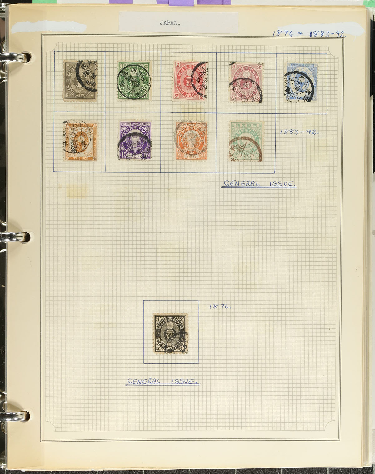 Collection of mint and used Japan, 1880's-1990's, containing a few thousand stamps, in roughly 100 well described pages, housed in 2 binders. The collection begins with primarily used issues up to 1940, and continues with a mixture of mint and used material, with some issues having a mint and a used example, along with a selection of souvenir sheets. A spot check revealed a few items cataloguing $10 and up, including Scott #519 (mh and used, c.v. $75 total), leaving better finds for the dedicated collector. Postmark interest includes bridge and other town postmark types. A nice opportunity for topical collectors as we note several subjects including nature, fish, flowers, butterflies, insects, and much more. Our photos show a small sampling. Estimate =
