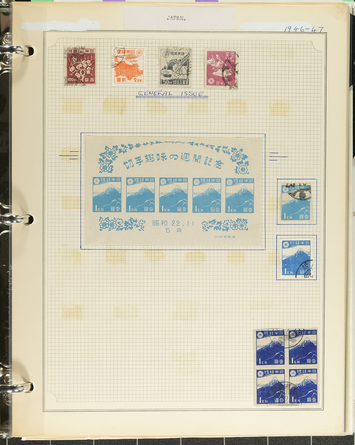 Collection of mint and used Japan, 1880's-1990's, containing a few thousand stamps, in roughly 100 well described pages, housed in 2 binders. The collection begins with primarily used issues up to 1940, and continues with a mixture of mint and used material, with some issues having a mint and a used example, along with a selection of souvenir sheets. A spot check revealed a few items cataloguing $10 and up, including Scott #519 (mh and used, c.v. $75 total), leaving better finds for the dedicated collector. Postmark interest includes bridge and other town postmark types. A nice opportunity for topical collectors as we note several subjects including nature, fish, flowers, butterflies, insects, and much more. Our photos show a small sampling. Estimate =