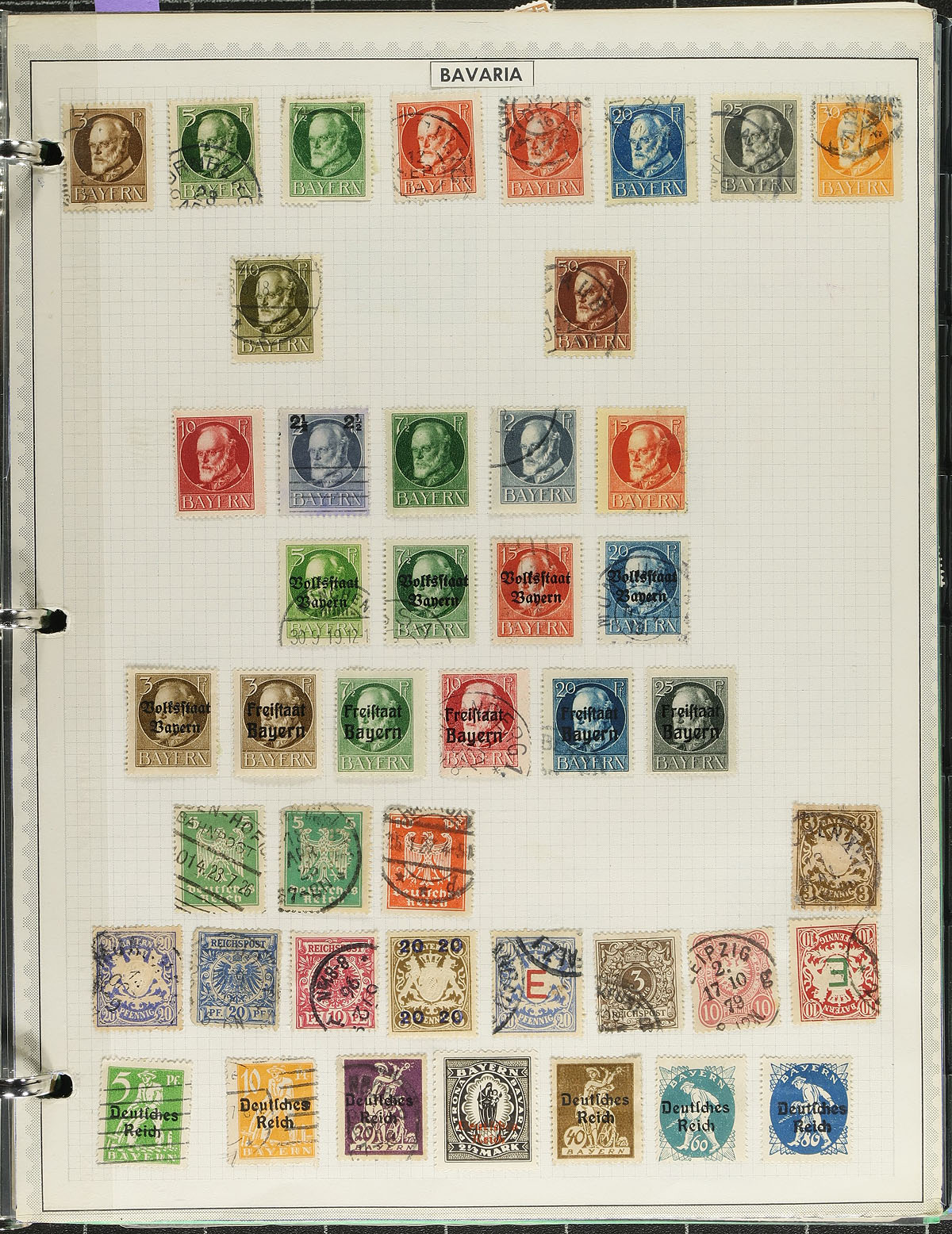 Large Collection / Accumulation of mint and used Germany, containing of a few thousand stamps, in stock and album pages, housed in 4 binders. A spot check of the lot revealed mint and used Germany, ranging from 1900 to the 1990's (including souvenir sheets and coil strips of 5), along with used States (noting primarily Bavaria), occupations, Berlin, and DDR issues, with some material cataloging $10 and up, leaving better finds to the dedicated collector. Postmark interest includes bridge and other town postmark types. Our online photos show a small sampling. Estimate =