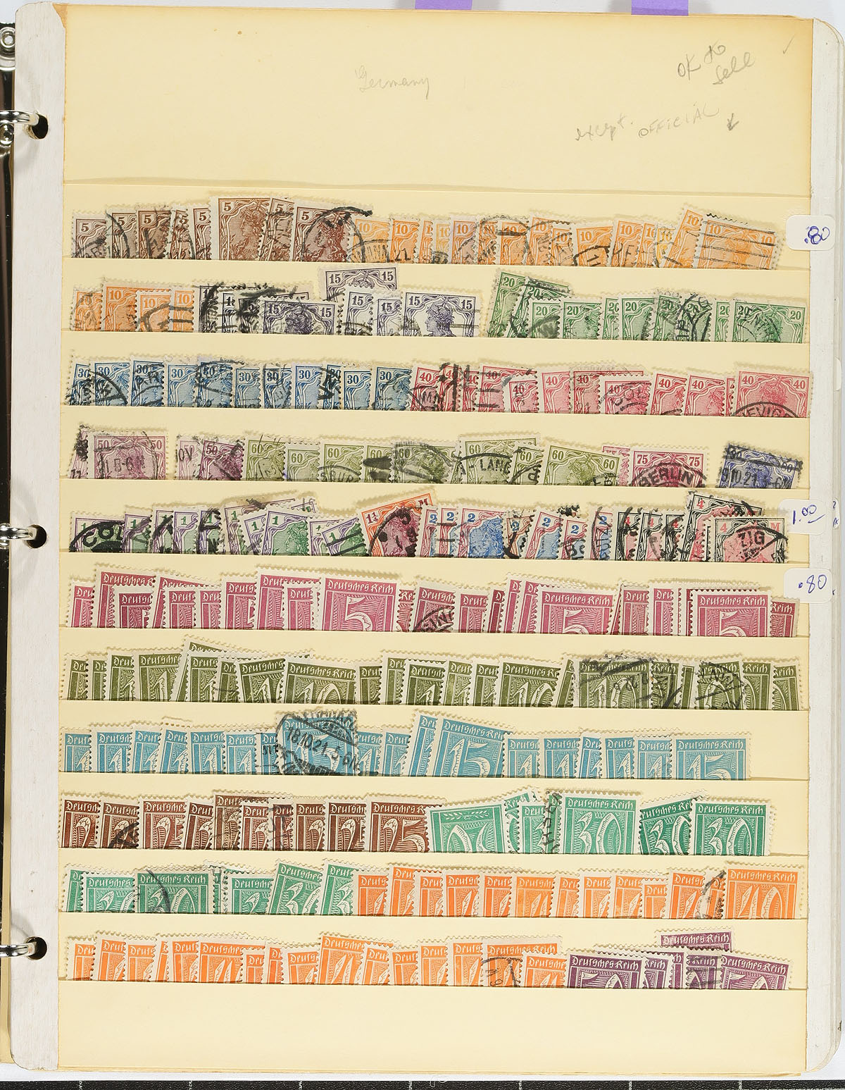 Large Collection / Accumulation of mint and used Germany, containing of a few thousand stamps, in stock and album pages, housed in 4 binders. A spot check of the lot revealed mint and used Germany, ranging from 1900 to the 1990's (including souvenir sheets and coil strips of 5), along with used States (noting primarily Bavaria), occupations, Berlin, and DDR issues, with some material cataloging $10 and up, leaving better finds to the dedicated collector. Postmark interest includes bridge and other town postmark types. Our online photos show a small sampling. Estimate =
