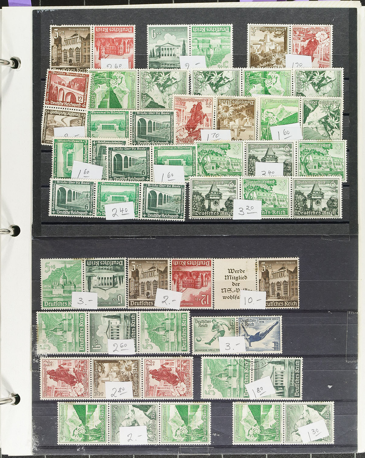 Large Collection / Accumulation of mint and used Germany, containing of a few thousand stamps, in stock and album pages, housed in 4 binders. A spot check of the lot revealed mint and used Germany, ranging from 1900 to the 1990's (including souvenir sheets and coil strips of 5), along with used States (noting primarily Bavaria), occupations, Berlin, and DDR issues, with some material cataloging $10 and up, leaving better finds to the dedicated collector. Postmark interest includes bridge and other town postmark types. Our online photos show a small sampling. Estimate =