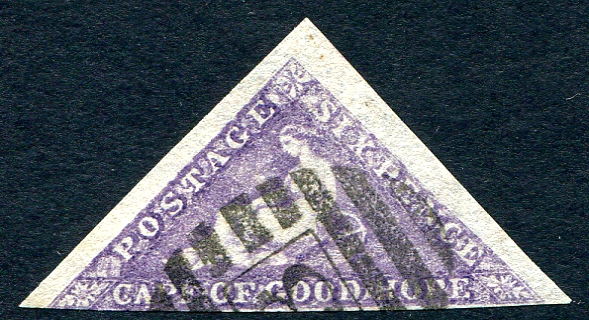 VF used example of the 1863 issue 6p purple triangle. Nice margins (just touching at bottom) and bright colour with appropriate numeral cancel (primarily used after the triangular cancelling devices). Listed in SG cat as #20 at £550.00 ($1010.00 CDN). 2025 Scott US$500.00 =