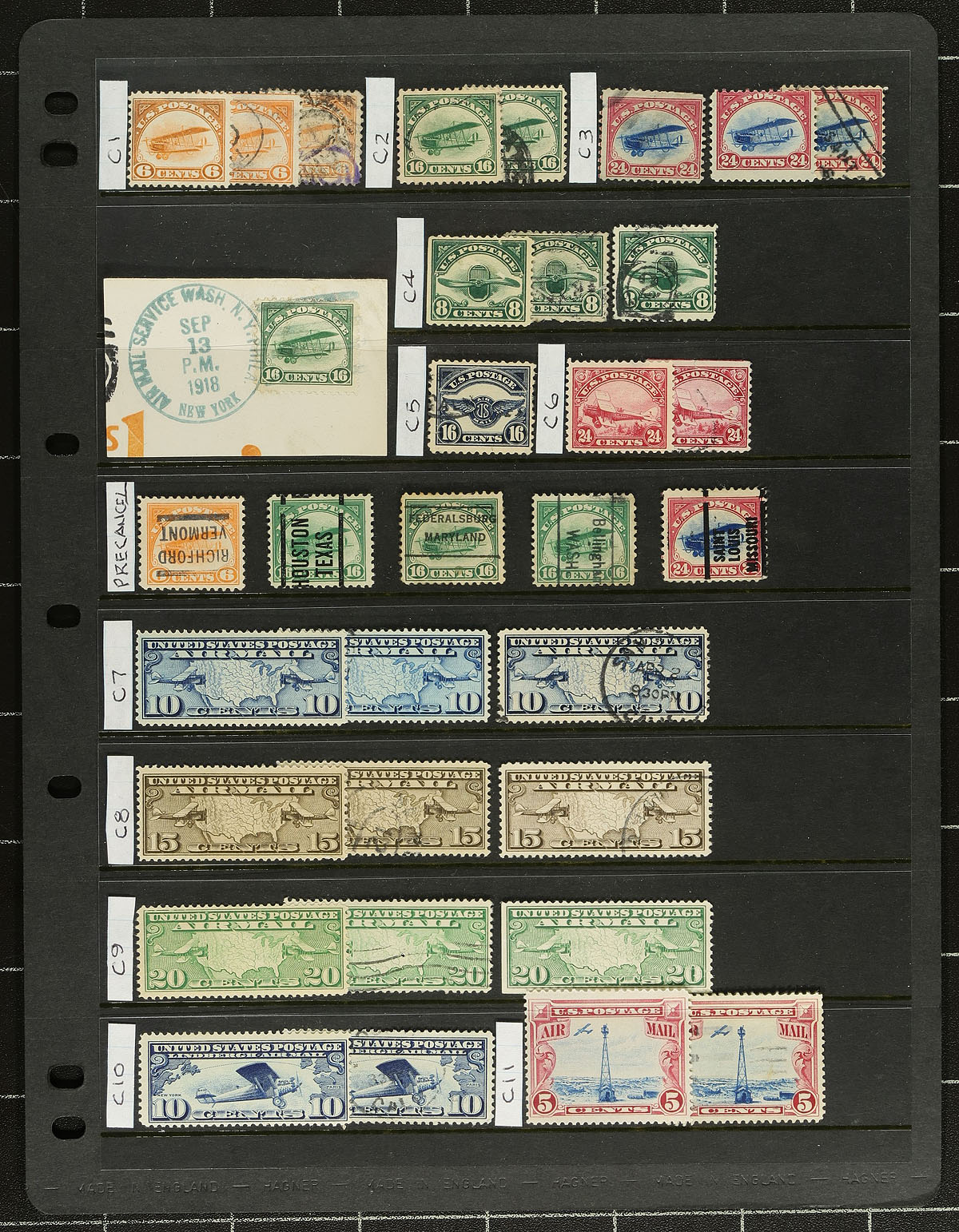 Specialized Air Mail, C1 - C31, CE1 - CE2. Sixty-nine stamps, including one on piece, mainly both Mint hinged and used, on two pages. Includes five precancels on early issues. Most catalogued colour variations are included as well. 2023 Scott =