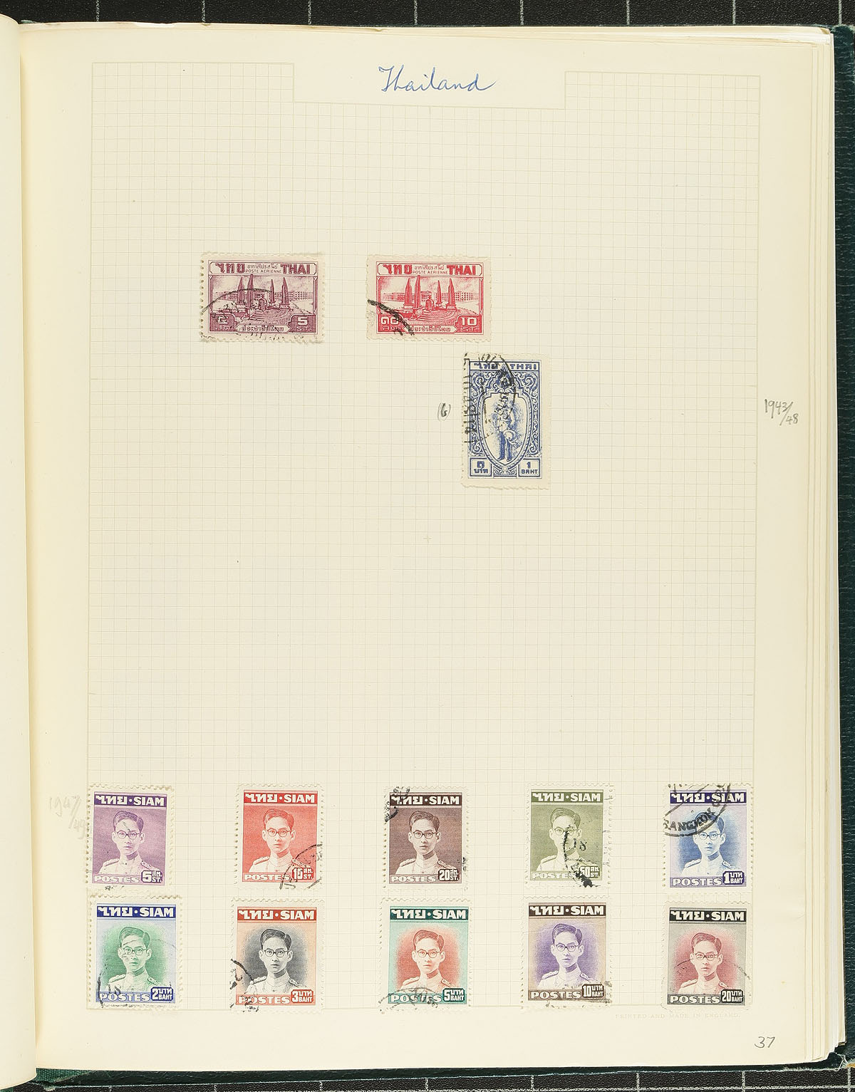 Used, mounted collection on quadrilled pages in a "Simplex" springback binder, with a good range of pre-1980 issues, including many nicer $5-$10 stamps and sometimes even better than that (noting Vietnam #33 and #35). The stamps are cleanly mounted, identified by year and the dealer has done a page-by-page tally of the current catalogue values. Some nice cancels and no obvious faults. The Thailand section is the largest (with a conservative Scott catalogue value of $750.00 and the Vietnam section catalogues $194.00). Total 2024 Scott US$$944.00 =