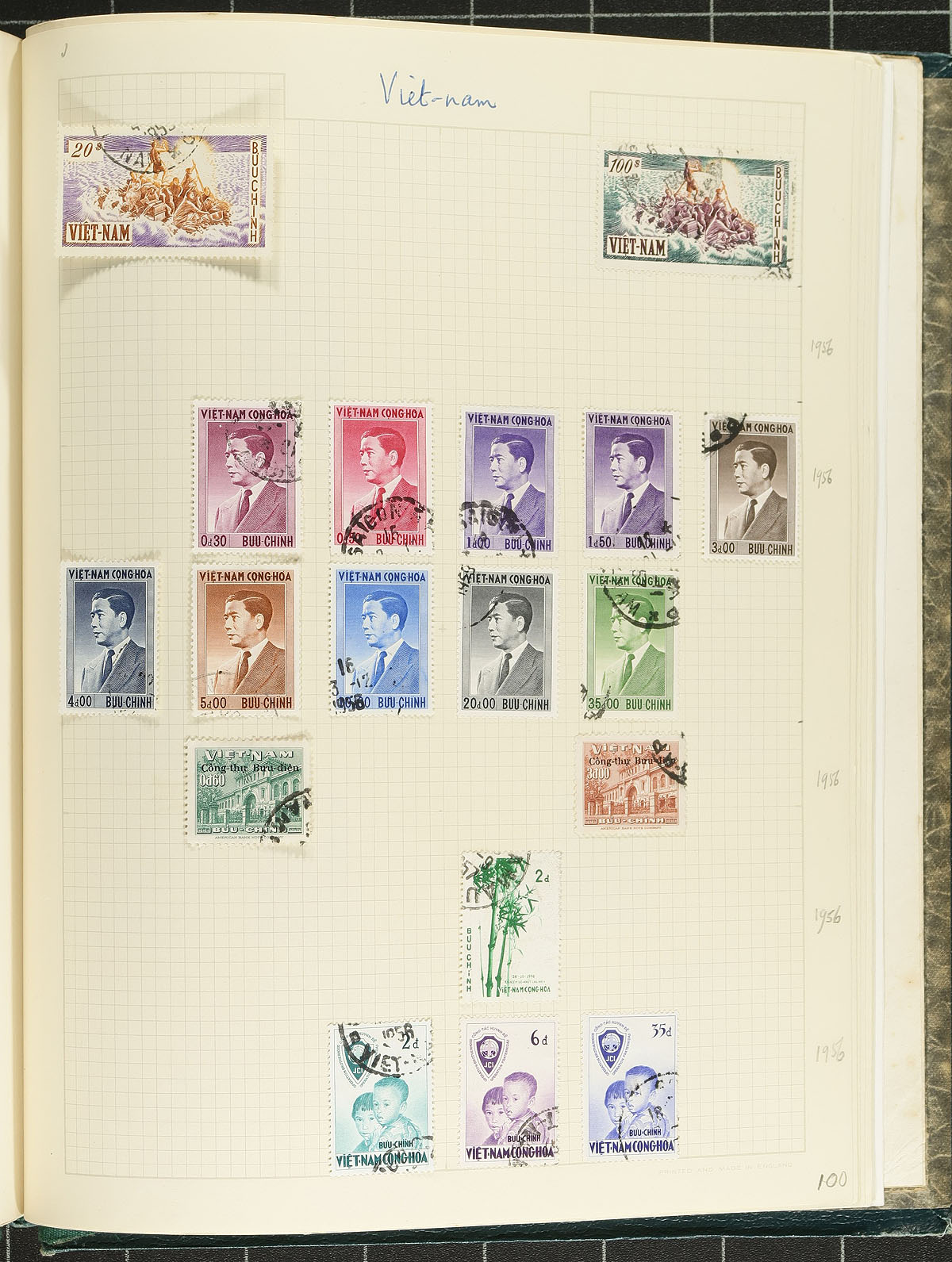 Used, mounted collection on quadrilled pages in a "Simplex" springback binder, with a good range of pre-1980 issues, including many nicer $5-$10 stamps and sometimes even better than that (noting Vietnam #33 and #35). The stamps are cleanly mounted, identified by year and the dealer has done a page-by-page tally of the current catalogue values. Some nice cancels and no obvious faults. The Thailand section is the largest (with a conservative Scott catalogue value of $750.00 and the Vietnam section catalogues $194.00). Total 2024 Scott US$$944.00 =