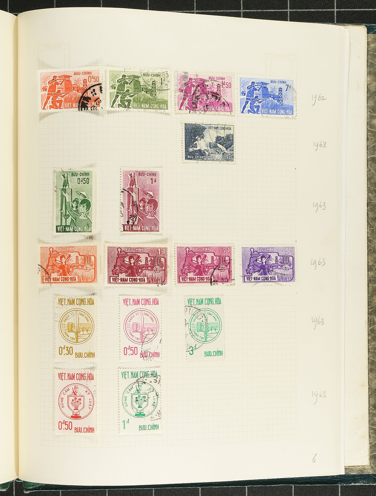 Used, mounted collection on quadrilled pages in a "Simplex" springback binder, with a good range of pre-1980 issues, including many nicer $5-$10 stamps and sometimes even better than that (noting Vietnam #33 and #35). The stamps are cleanly mounted, identified by year and the dealer has done a page-by-page tally of the current catalogue values. Some nice cancels and no obvious faults. The Thailand section is the largest (with a conservative Scott catalogue value of $750.00 and the Vietnam section catalogues $194.00). Total 2024 Scott US$$944.00 =