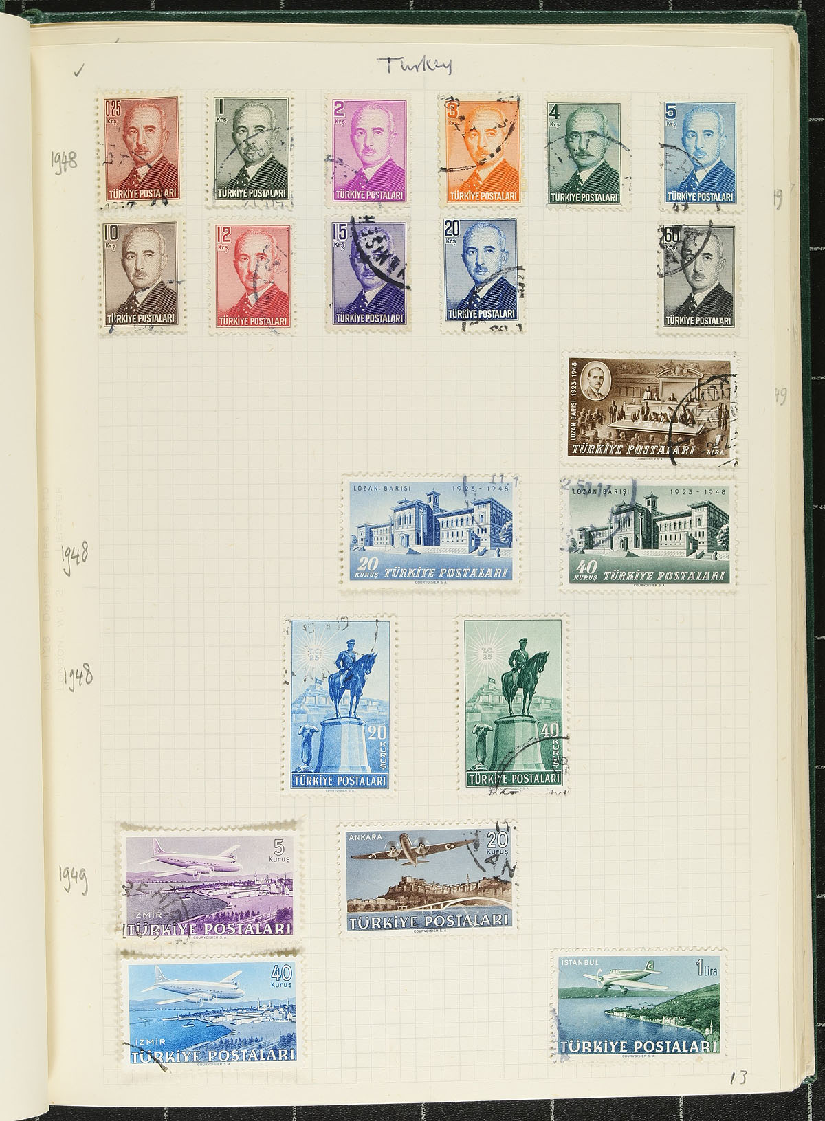 A pair of collections of used stamps going from 1876 to the late 1970's, neatly mounted on quadrilled pages, in springback albums (one "Adelphi" the other "Toronto" from Mark’s Stamp Company!). Despite being from different sources, there is no overlap, and the makes for a great way to start a collection of this European-Middle Eastern hybrid. Probably about 400 different stamps, with a little bit from the "back of the book". Owner’s meticulous 2024 Scott US$415.00 =