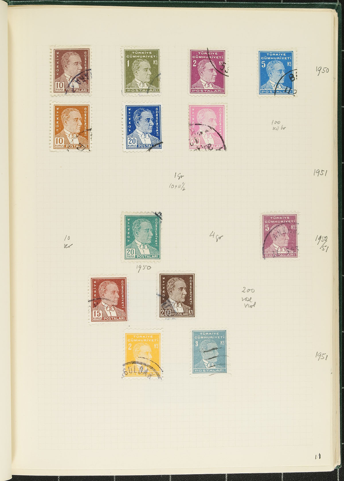 A pair of collections of used stamps going from 1876 to the late 1970's, neatly mounted on quadrilled pages, in springback albums (one "Adelphi" the other "Toronto" from Mark’s Stamp Company!). Despite being from different sources, there is no overlap, and the makes for a great way to start a collection of this European-Middle Eastern hybrid. Probably about 400 different stamps, with a little bit from the "back of the book". Owner’s meticulous 2024 Scott US$415.00 =